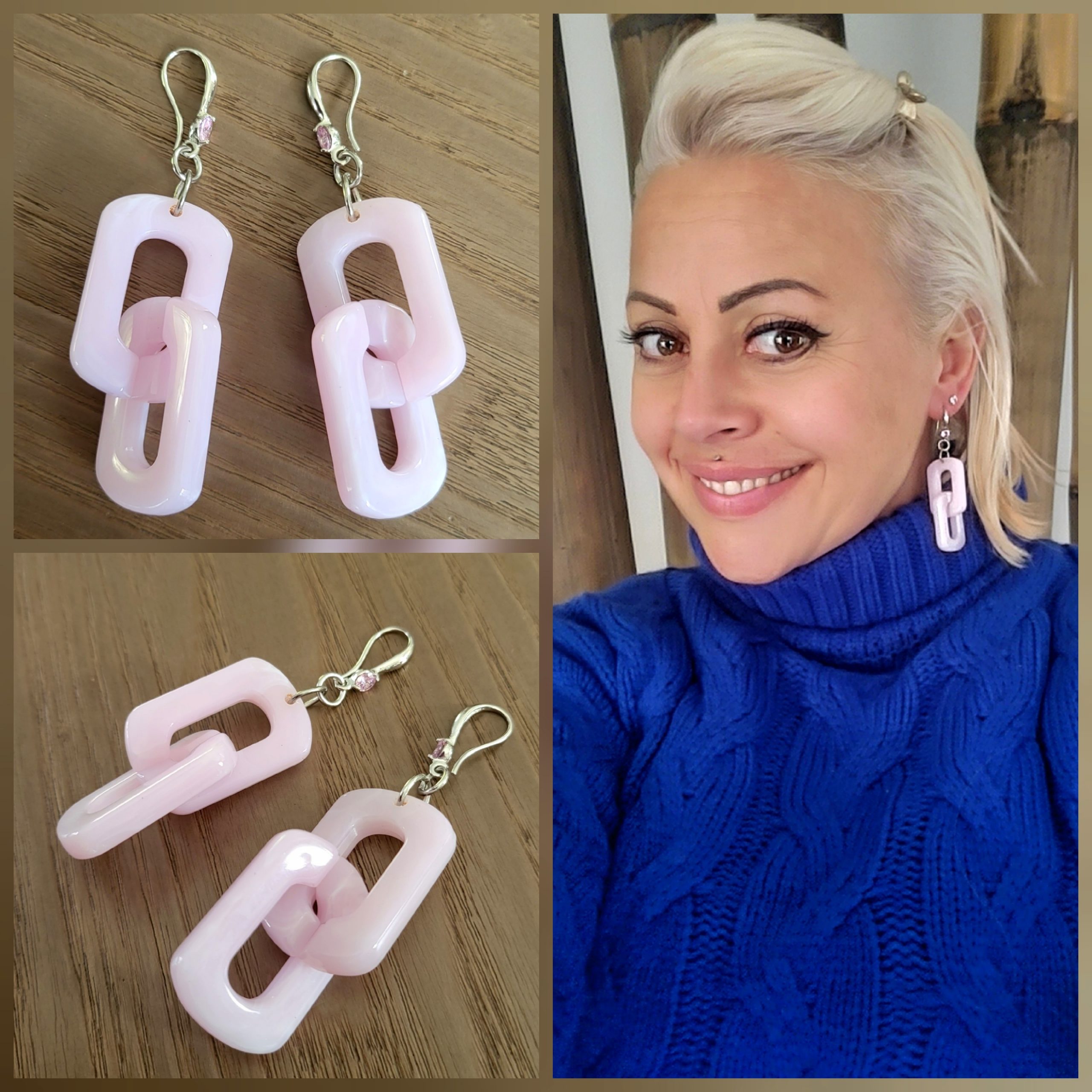 Boucle d’oreille en résine couleur marbrée en forme de maillons emboités et de son crochet en acier inoxydable argenté et Zirconium Rose.