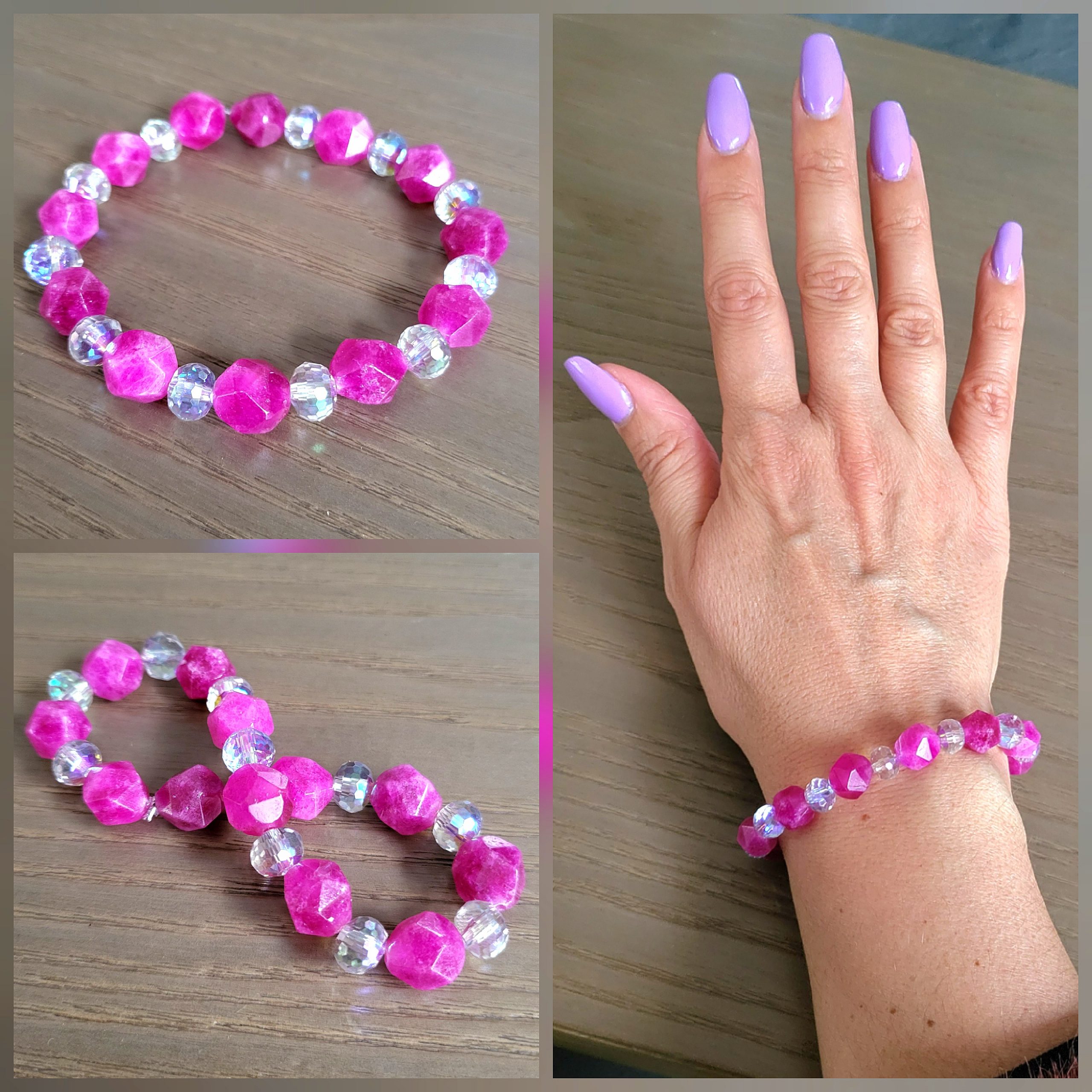 Bracelet extensible de perles à facettes de Quartz rose teinté Fuchsia en 9-10 mm et de Cristal de Moissanite 7 mm, le tout monté sur un lien solide et durable en nylon extensible de 1mm et sertis par une soudure en acier inoxydable. L’avantage de ce lien c’est qu’il ne s’effiloche pas même dans le temps.