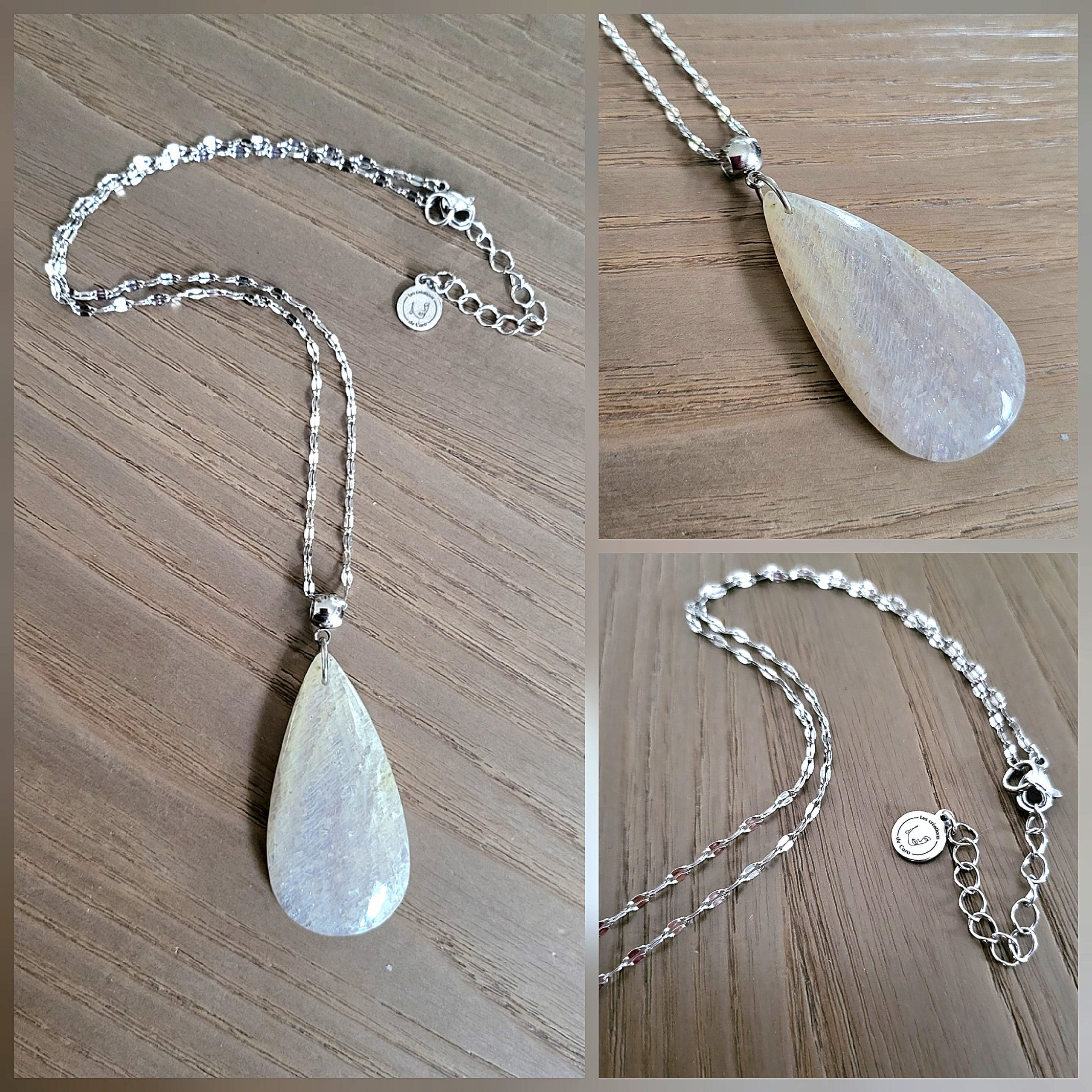 Délicat collier avec chaine en acier inoxydable argenté et son joli pendentif de Pierre de Lune, et signé de sa plaque « Les Créations de Caro ».