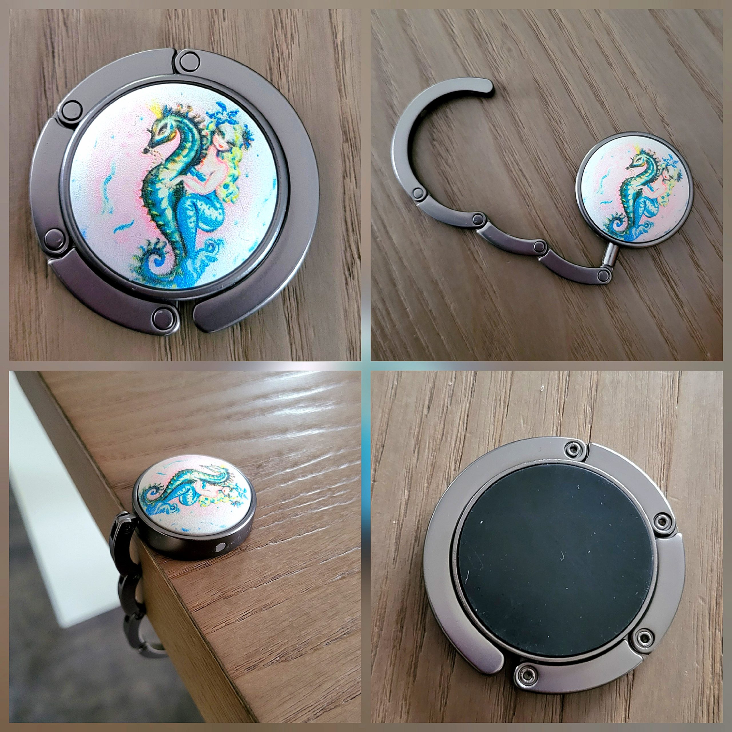 Original et Pratique, ce Superbe Porte sac à main en acier anthracite et cabochon en verre rond de 30 mm de diamètre avec motif impression numérique.